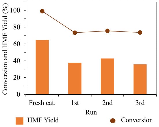 Since the direct conversion of glucose to HMF is a consecutive reaction process accompanied by various side reactions, the reaction time is an important parameter to control the products selectivity and enhance the HMF yield. Herein, the effect of reaction time was studied in the range of 40–80 min (Figure 7B). At 40 min, an HMF yield of 56.1% was obtained at 88.0% glucose conversion, along with a fructose and LA yield of 3.8% and 2.0%, respectively. As the reaction time was prolonged to 60 min, the conversion of glucose jumped to >99% and the yield of HMF was achieved at 64.7%. There was no significant change in the glucose conversion and HMF yield at 80 min, but the distribution of byproducts was altered. Atanda et al. [47] reported that the transformation of HMF to humins at a certain temperature was a function of time. Recently, an acid concentration dependence kinetic study demonstrated that the polymerization and condensation of HMF proceeded at different reaction rates to the rehydration of HMF to LA [38]. In a strong acid-catalyzed system without any glucose and fructose, the rate of HMF conversion into LA was larger than that of HMF-derived humin formation. Considering the HMF yield and ease of products separation, the reaction time of 60 min was a suitable period for the HMF synthesis in this study.