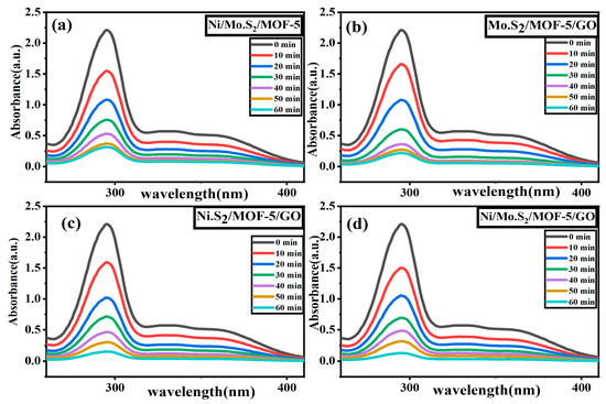 Absorbance spectra of moxifloxacin (MOX) (a) Ni/Mo.S2/MOF-5/GO, (b) Mo.S2/MOF-5/GO (c) Ni.S2/MOF-5/GO, (d) Ni/Mo.S2/MOF-5 nanocomposites.