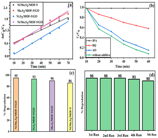 where Ct = concentration at time t, C0 = initial concentration, e = base e, k = rate constant of decline/day, t = time, and ln = natural log. By plotting −ln (Ct/C0) on the y-axis and irradiation time (t) on the x-axis, a straight line is obtained, as shown in Figure 5a, where the k values of samples Ni/Mo.S2/MOF-5/GO (0.044 min−1), Ni.S2/MOF-5/GO (0.043 min−1), Mo.S2/MOF-5/GO (0.041 min−1), and Ni/Mo.S2/MOF-5 (0.033 min−1) were calculated from the slope.