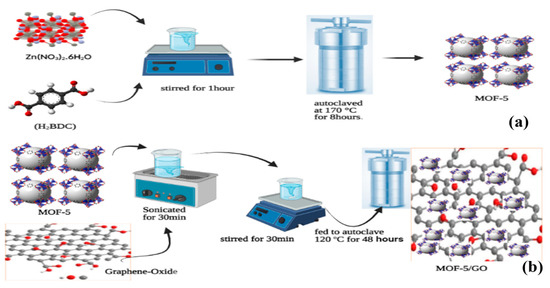 With multiple changes to a typical MOF-5 [67], the MOF-5/GO nanocomposite was synthesized by adapting the single-step solvothermal method. Initially, 0.6 g of Zn (NO3)2·6H2O and 0.12 g of terephthalic acid H2BDC were dispersed in 60 mL of DMF to obtain a final clean solution. To create a homogenized DMF emulsion of graphene oxide, 0.36 g of GO was sonicated into a solution of 10 mL of DMF for 120 min [68]. Following the addition of the GO suspension, the previously clean solution was stirred for an additional 30 min, before being transferred to a 100 mL stainless-steel autoclave lined with Teflon and heated to 120 °C for 48 h. After that, a vacuum drying process employing a desiccator fitted with a heater at 80 °C for 12 h was used to produce the resulting solid sample, which was cleaned with DMF and CHCl3. The hybrid materials were named MOF-5-GO in their first state of synthesis.
