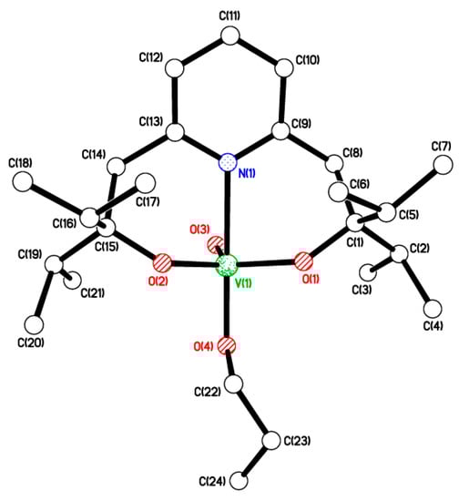 The reaction of 6-bis(o-hydroxyaryl)pyridine, 2,6-{HOC(Ph)2CH2}2(NC5H3), LH2 [57], with one equivalent of [VO(OiPr)3] in refluxing toluene afforded, after workup (MeCN), yellow crystalline [VO(OiPr)L] (1) in good yield. In the IR spectrum, the band at 1024 cm−1 is assigned to vV=O, whilst the 51V NMR spectrum (C6D6, 298 K) contains a single peak at δ −572.81 with Δω½ 3.8 Hz. Single crystals of 1 were grown from a saturated solution in acetonitrile at ambient temperature. The molecular structure is shown in Figure 1, and selected bond lengths and angles are given in the caption. There is one molecule in the asymmetric unit. The trigonal bipyramidal vanadyl centre (τ = 0.97) [58] is chelated by the pyridine diolate ligand with the pyridyl N being axial, an oxo ligand equatorial, and an axial OiPr ligand. The two diolate oxygen atoms complete the equatorial donor set. There is an intramolecular C(3)–H(3)···π{C(27)} interaction at 2.83 Å, between two Ph groups at opposite ends of the pyridine diolate ligand. In the packing, there are some weak C–H∙∙∙O/π interactions.