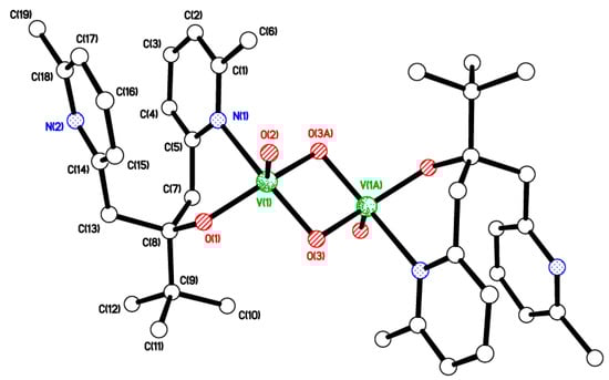 The reaction of (tBu)C(OH)[CH2(C5H3Me-5)]2 [55] with one equivalent of either [VO(OEt)3] or [VO(OiPr)3] in refluxing toluene afforded, after workup (MeCN), yellow crystalline [VO(μ-O)(L2)]2 (6) in moderate yield (ca. 40%). In the IR spectrum, the band at 1019 cm−1 is assigned to vV=O, and the 51V NMR spectrum (C6D6, 298 K) contains a broad peak at δ –539.3 with Δω½ 3520 Hz (see Figure S4 right, ESI). Small single crystals of 6 were grown from a saturated MeCN solution on standing for 24 h at 20 °C. The molecular structure is shown in Figure 5, with selected bond lengths and angles given in the caption. There is half a molecule in the asymmetric unit, and the molecule lies on an inversion centre. Only one of the two pyridyl nitrogen atoms binds to the metal ion from each ligand. There is approximate square-based pyramidal geometry at the V centre. The V2O2 diamond is fairly symmetrical, with very similar V–O bonds on each side. Pyridyl rings are not quite parallel, with a dihedral angle of 17.6° between them. This is illustrated by looking at a comparison of the distances C(5)…C(14) = 3.078 and C(2)…C(17) = 4.023 Å. The anti-arrangement of the Me groups on the pyridine rings is undoubtedly to minimize steric interaction. Molecules of 6 are arranged in layers with nothing unusual in terms of intermolecular interactions (see Figure S5, ESI).