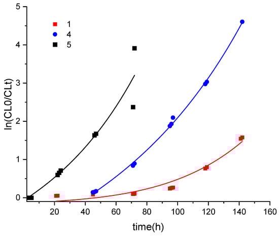 In(CL0/CLt) versus time for PCL runs using 1, 4, and 5 (500:1, 130 °C, N2).