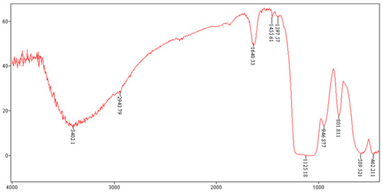 The preparation of the catalysts used in this study can be found in the Experimental Section. The MNPs-SiCoFe-SO3H catalyst was analyzed using various methods. The Fourier transform infrared spectroscopy (FT-IR) spectrum of MNPs-SiCoFe-SO3H is shown in Figure 1 The Fe–O bonds were identified by the strong absorption bands at 589 cm−1 and 462 cm−1. These peaks corresponded to the stretching vibrations of Fe–O bonds in the catalyst’s structure. Furthermore, the FT-IR spectrum exhibited a broad peak within the range of 1000–1250 cm−1, which could be attributed to the Si-O stretching vibrations present in the silica shell that surrounded the magnetic nanoparticles (MNPs) [30]. The presence of the alkyl groups in MNPs-SiCoFe-SO3H was confirmed by the aliphatic weak C–H stretching vibrations appearing at 2943 cm−1. However, detecting evidence of the SO3H groups was challenging due to the low loadings of acidic components and the overlapping of peaks associated with Si–O–Si, Fe–O–Si, and symmetric SO2 stretching [31].