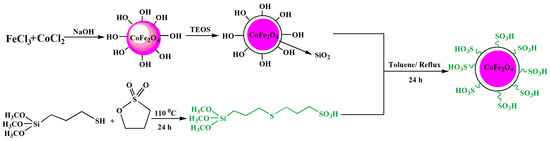 Sulfonic-acid-functionalized, silica-coated MNPs (HSO3-SiCoFe-MNPs) were synthesized through a one-pot procedure (Scheme 3) [28]. Initially, a mixture of 3-mercapt opropyl trimethoxysilane (2.95 mL, 16 mmol) and 1,3-propanesultone (1.62 mL, 16 mmol) was heated for 24 h at 110 °C. The resulting product was dissolved in 25 mL of toluene, followed by the addition of Si-MNPs (0.55 g). The mixture was refluxed under a nitrogen atmosphere for 24 h. Finally, the silica-coated cobalt ferrite magnetic nanoparticles functionalized with sulfonic acid (MNPs-SiCoFe-SO3H) were separated using an external magnet and washed thoroughly with toluene and ether.