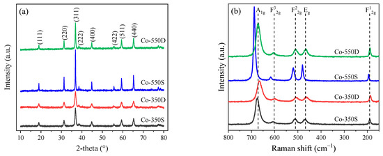 Raman spectra were obtained to further study the lattice distortion of the Co3O4 catalysts. As displayed in Figure 1b, five Raman peaks correspond to A1g, F32g, F22g, Eg, and F12g symmetries can be seen for all catalysts [18,40,41]. The calcination condition has a significant effect on the Raman spectra of Co3O4. For example, the peak positions of A1g symmetry in all catalysts follow the order Co-350D (667 cm−1) < Co-550D (670 cm−1) < Co-350S (675 cm−1) < Co-550S (688 cm−1). The full width at half-maximum (FWHM) of A1g symmetry decreases in the same order (Table 2). Thus, more defects caused by lattice distortion or residual stress of spinel crystal were present in Co3O4 catalysts calcined at low temperatures or under dynamic air [18], in line with the XRD analysis. In addition, the peak area ratios of F12g/A1g (tetrahedral Co3+–O2−/octahedral Co2+–O2− [40]) were calculated and summarized in Table 2. The results demonstrated that Co-350D possessed the highest concentration of Co2+ and oxygen defects [24].