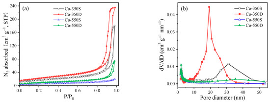 (a) N2 adsorption–desorption isotherms and (b) pore size distribution curves of Co3O4 catalysts calcined under different conditions.