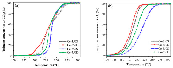 The catalytic stability of the optimal catalyst Co-350D was studied by performing three consecutive catalytic cycles. As shown in Figure 5, the light-off curves of the three cycles were almost coincident, no matter in toluene or propane oxidation, suggesting the excellent cycling stability of the catalyst.