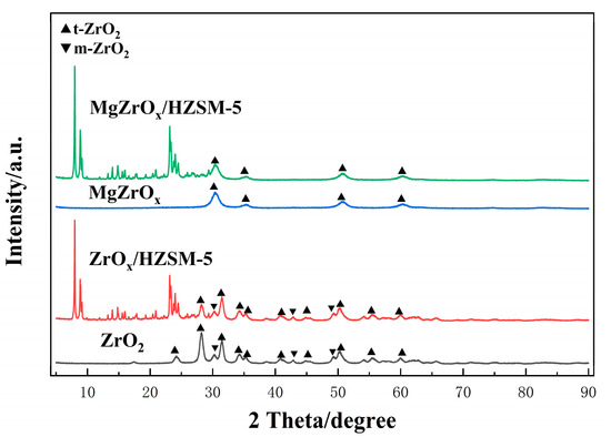 The XRD patterns of the fresh ZrO2, MgZrOx, ZrO2/HZSM-5, and MgZrOx/HZSM-5 catalysts are presented in Figure 1. The XRD diffraction peaks of the ZrO2 catalyst after roasting are mainly tetragonal phase (t-ZrO2), accompanied by a small amount of monoclinic phase (m-ZrO2) peaks. The XRD diffraction peaks of MgZrOx catalysts were mainly t-ZrO2, while the m-ZrO2 peak disappeared and transformed into t-ZrO2 with the doping of the Mg element, and no MgO phase was observed. Similar to the report of Huang et al., there is only a ZrO2 peak in the XRD spectrum after the doping of the Zn metal element in a Zr-based catalyst. It is concluded that the solid solution structure is composed of the Mg element and the ZrO2 metal oxide [14,15]. After the bifunctional catalyst was formed using a coupling molecular sieve, the XRD spectrum of ZrO2/HZSM-5 and MgZrOx/HZSM-5 retained the diffraction peak of the metal oxide catalyst, but only the diffraction peak of the molecular sieve was added, indicating that the mixing of the metal oxide catalyst and molecular sieve powder had no effect on the crystal phase of the catalyst.