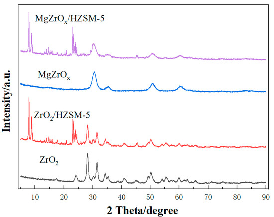 Figure 2 shows the XRD patterns of ZrO2, MgZrOx, ZrO2/HZSM-5, and MgZrOx/HZSM-5 catalysts after the reaction. Compared to Figure 1, it is found that the XRD diffraction peaks of the catalysts after the reaction are slightly reduced, which is believed to be caused by the covering of carbon generated in the reaction, and the accumulation and growth of catalyst particles after the reaction. However, the XRD diffraction peaks of the bifunction catalyst showed no additional diffraction peaks except for the peaks of HZSM-5 in the range from 10° to 25°, indicating that there was no additional phase after the metal oxide and HZSM-5 were physically mixed to form the bifunction catalyst. Additionally, the peak intensity of the bifunction catalyst decreased compared with the single metal oxide, which was believed to be caused by the reduction of the metal oxide [8,16].