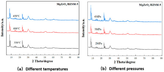 XRD patterns of the used MgZrOx/HZSM-5 catalysts under different experimental conditions. (a) Different temperatures. (b) Different pressures.