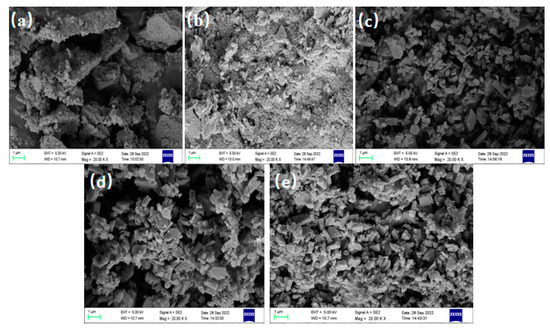 SEM images of the fresh catalysts. (a) ZrO2. (b) MgZrOx. (c) ZrO2/HZSM-5. (d) MgZrOx/HZSM-5. (e) HZSM-5.
