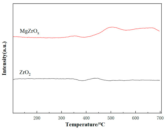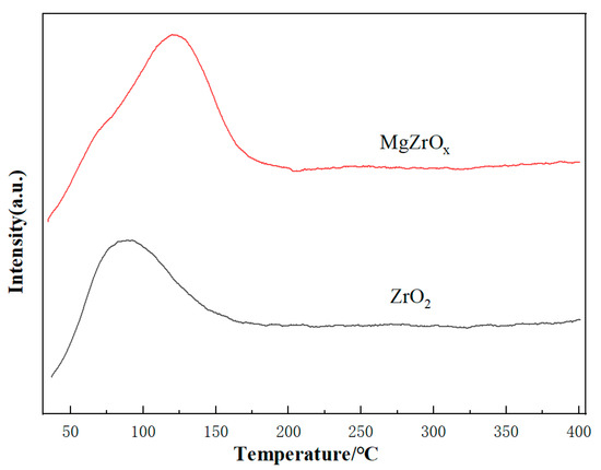 The basicity of ZrO2 and MgZrOx catalysts was detected by CO2-TPD, and the profiles are shown in Figure 7. There is only one single large desorption peak for the ZrO2 and MgZrOx catalysts, and the ZrO2 metal oxide is near 90 °C, while the MgZrOx-doped metal oxide is near 120 °C. After the doping of the Mg element, the CO2 desorption peak migrated towards high temperature and the peak area increased, indicating that the MgZrOx catalyst had a stronger physical adsorption capacity and alkalinity for CO2 than the ZrO2 catalyst [15,23,24].