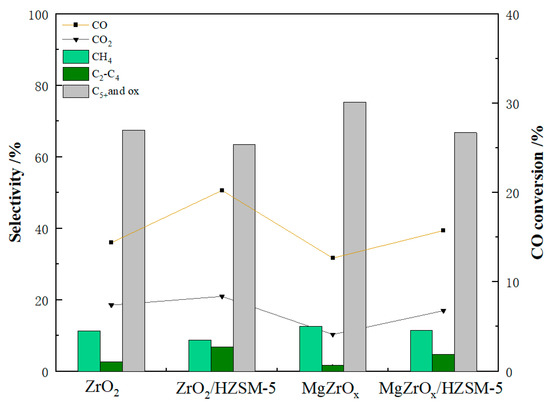 The reaction performances of direct syngas conversions to aromatics on different Zr-based catalysts and HZSM-5 mixed bifunctional catalysts are presented in Figure 8. The CO conversion of the ZrO2 catalyst is 14.4% and the selectivity of C5+ and oxygenates is 67.5%. After doping Mg, the conversion of CO for the MgZrOx catalyst decreases to 12.7%, and the selectivity of the CO2 decreases (18.5–10.3%), while the selectivity of C5+ and oxygenates increases to 75.4%. Compared with the ZrO2/HZSM-5 catalyst, the conversion of CO for MgZrOx/HZSM-5 decreased from 20.2% to 15.8% after coupling with HZSM-5, and the selectivity of CO2 decreased slightly (21–17%), while the selectivity of C5+ and oxygenates products increased (63–67%). The results showed that the addition of the molecular sieve did not change the influence of the Mg-modified Zr-based catalyst on the catalytic performance of the synthesis of gas to aromatics, which was manifested by the reduction in CO conversion, the reduction in CO2 selectivity, and the increase in C5+ product selectivity. The reduction in CO2 selectivity is caused by the fact that metal Mg can reduce the activity of the water–gas shift reaction and it can increase the activity of the C-C coupling reaction, promoting the generation of low-carbon olefins and thus increasing the selectivity of C5+ products [25]. Similar to the Ce element doped in the ZrO2 catalyst reported by Zhou et al. [10], the conversion of CO did not increase, indicating that neither the doping of Ce nor Mg could promote the adsorption and conversion of CO.