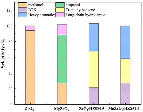The distributions of C5+ hydrocarbons and oxygenates on different bifunctional catalysts and the MgZrOx/HZSM-5 catalysts are shown in Figure 9. Compared to the ZrO2/HZSM-5 catalyst, the BTX component in the liquid products of the MgZrOx/HZSM-5 catalyst increases to 27.4%, and the content of trimethylbenzene decreases to 30.7%, while the content of heavy aromatics increases. Furthermore, no long-chain hydrocarbon appears in the liquid products of ZrO2/HZSM-5 and MgZrOx/HZSM-5 catalysts. The above results indicate that the doping of Mg is conducive to the formation of BTX and heavy aromatics. Compared to the molecular sieves modified by Mg, reported by Yang et al. [23], at the cost of reducing the selectivity of aromatics and increasing the selectivity of xylene, doping Mg into metal oxide catalysts can not only increase the proportion of BTX in liquid phase products, but can also increase the selectivity of aromatic products.