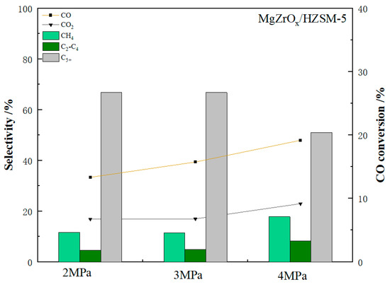 In order to study the effect of reaction pressure on the direct synthesis of aromatic hydrocarbons from syngas on a MgZrOx/HZSM-5 catalyst, the reaction pressure ranged from 2 MPa to 4 MPa, while the other reaction conditions were fixed. Figure 12 shows the effect of pressure on the catalytic performance of MgZrOx/HZSM-5. As the reaction pressure increases from 2 MPa to 4 MPa, the CO conversion rate increases from 13.3% to 19.2%. This is due to the fact that the volume of the reaction of syngas to aromatics from oxygen-containing intermediates decreases, so increasing the reaction pressure can significantly increase the CO conversion but has little effect on aromatic selectivity [31]. When the pressure is low (less than 3 MPa), the selectivity of C5+ and CO2 products does not obviously change, being about 66.8% and 17%, respectively. However, when the pressure rose to 4 MPa, the selectivity of methane increased to 17.8%, the selectivity of low carbon hydrocarbons increased to 8.26%, and the selectivity of C5+ products decreased to 51% because high pressure results in an increase in hydrogenation activity [26]. Similar to the effect of pressure on ZnCr2O4/ZSM-5 catalysts reported by Yang et al. [27], the increasing pressure in the range of 1 MPa-3 MPa can significantly increase the conversion of CO, while the selectivity of aromatic products shows little change.