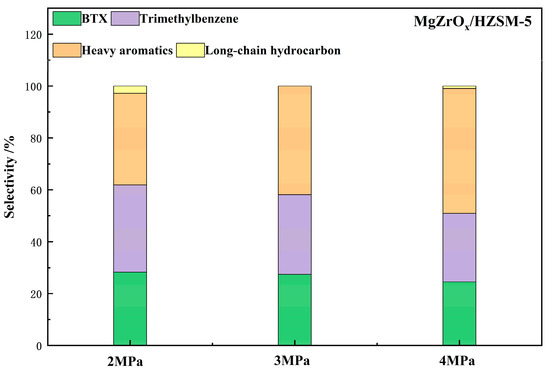 Figure 13 shows a schematic diagram of the distribution of liquid products on the MgZrOx/HZSM-5 catalyst with pressure change. With the increase in pressure from 2 MPa to 4 MPa, most of the liquid products are aromatics, and the proportion of heavy aromatics increases (35.3–48.1%), while the proportion of trimethyl benzene decreases (33.7–26.4%). This result is due to the higher activity of the carbon chain growth reaction under high pressure, resulting in an increase in selectivity for heavy aromatic hydrocarbons [32]. The proportion of the BTX component was not obviously changed at a low pressure (less than 3 MPa), being about 27.8%. When the pressure is 2 MPa, the liquid products contain a small number of long-chain hydrocarbon products (7.2%) because the low pressure weakens the aromatization ability. When the pressure rises to 4 MPa, the BTX component of light aromatic hydrocarbons is 24.5%, and there are traces of long-chain hydrocarbons (0.96%) because of the carbon chain growth of the intermediate and the strong isomerization activity of aromatics. Similar to the study of Cr2O3/ZSM-5 catalysts by Liu et al. [30], there is little change in the proportion of BTX components with the increase in pressure.