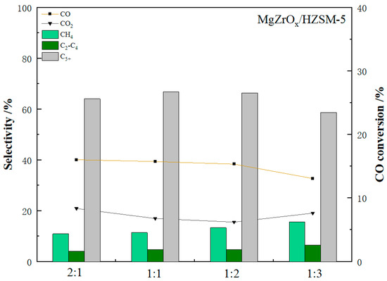 Figure 14 shows the variation in CO conversion and product selectivity catalyzed by MgZrOx/HZSM-5 at different mass ratios. As the increase in the mass ratio of metal oxides to HZSM-5 increases from 1:3 to 2:1, the CO conversion rate slowly increases from 13.1% to 16%. The results showed that when the mass ratio of metal oxide catalysts increased, the conversion of CO slightly increased, which corresponds to the decrease in CO conversion after doping Mg in the initial experiment [34]. When the mass ratio of MgZrOx to HZSM-5 is too low (1:3) or too high (2:1), the doping of Mg cannot reduce the generation of CO2, the selectivity of which is about 20% [8]. With the increase in the mass ratio of metal oxides to HZSM-5, the selectivity of low carbon hydrocarbons decreases (6.5–4.1%) as the ability of the bifunctional catalyst to convert syngas increases. In the larger mass ratio range (2:1–1:2), the selectivity of C5+ products does not obviously change, being about 65%. When the mass ratio of metal oxides to HZSM-5 was too low (1:3), the selectivity of C5+ products decreased to 58.7%, and the selectivity of methane increased to 15.6% because the MgZrOx catalyst could not provide enough intermediate products during the reaction. Compared with the study of Cheng et al. [27], the mass ratio of metal oxides to molecular sieves to Zn-ZrO2/ZSM-5 catalysts decreased from 2:1 to 1:2, and the aromatic selectivity increased from 61% to 73%, but the CO conversion of the catalyst decreased significantly from 32% to 16%. It is considered that the different changes in CO conversion are due to the inability of Mg doping to promote CO adsorption activation.