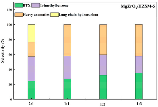 Figure 15 shows the variation in the liquid phase product distribution of MgZrOx/HZSM-5 catalyst under the different mass ratios of metal oxide to HZSM-5. When the mass ratio of metal oxides to HZSM-5 is 1:3–1:1, the liquid products are almost equal to the aromatic products. However, when the mass ratio of metal oxides to HZSM-5 rises to 2:1, the liquid products contain a large number of long-chain hydrocarbons (23.35%) and the BTX component is smaller, about 25%, as the high content of metal oxide means the HZSM-5 cannot rapidly convert the intermediates. When the mass ratio of metal oxide to HZSM-5 is 1:3, the BTX component in the liquid product reaches the maximum of 35.3%, but the overall content of the BTX component is not high, and, due to that, the C5+ selectivity is low under this condition (58.7%). When the mass ratio of HZSM-5 to the metal oxide catalyst was 2:1, the selectivity of the C5+ product was 65%, and the BTX component of the liquid phase product was 32.2%. This indicates that sufficient amounts of the HZSM-5 molecular sieve are required by the dual-function catalyst for the conversion of oxygen-containing intermediates to aromatics through the oligomerization, cyclization, and isomerization reactions [17]. Similarly, Cheng et al. reported that when the mass ratio of metal oxide catalyst to molecular sieve decreased from 2:1 to 1:2, the selectivity of long-chain hydrocarbons in liquid products decreased from 7.4% to 2%, and the selectivity of target product aromatics increased to 73% for the ZnO-ZrO2/HZSM-5 catalyst [9].