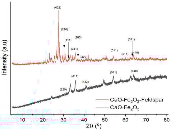 The XRD patterns of the nano-magnetic catalyst CaO/Fe2O3/feldspar and CaO/Fe2O3 are depicted in Figure 1. The results indicated that the CaO/Fe2O3/feldspar has several peaks at different angles, which indicated a crystalline structure. The prominent peaks were observed at 2θ = 30°, 32.34°, 35.55°, 37.36°, 43.5°, 53.61°, 63.15°, and 64.27°, which was attributed to the crystalline phases of (220), (111), (311), (200), (422), (511), (440), and (311), respectively (ICSD File No. 00-006-0711 and 00-032-0168) [17] [Maryam et al. 2021]. These indicated that Fe2O3 and CaO were present in the structure of the catalyst [16]. The intense sharp diffraction peaks within 2θ = 25–30° and the specifically intense peak at 27.4° suggested the presence of feldspar [18], which possessed a uniform structure and pore diameter. The narrow peaks showed the single phase of a highly ordered structure, which was indicated in the FESEM analysis as well (Figure 2). The crystal size of CaO/Fe2O3/feldspar nanoparticles calculated from the Scherrer equation was 45.73 nm.
