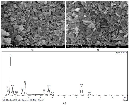 Figure 2a,b depict different surface roughness, particle sizes, and arrangement of particles, which is very important for the conversion of oil into biodiesel. Figure 2a shows the agglomeration and coral-like shape, whereas the CaO-Fe2O3 composite attached to the surface of feldspar (Figure 2b) indicates a morphology of well-arranged small platelets laced with pores. The surface morphology by SEM thus confirmed the successful synthesis of the CaO-Fe2O3 nano-catalyst supported on the feldspar, which was also indicated by the EDX analysis. A close inspection of the spectra revealed an exact wt.% of O (43.46%), Na (0.99%), Al (2.18%), Si (6.69%), K (1.34%), Ca (8.66%), and Fe (36.68%) elements in the CaO/Fe2O3/feldspar catalyst, as presented in Table 1. Based on the EDX analysis, the CaO-Fe2O3 was rich in Fe with a 59.82 wt.% composition. The large amount of O (37.12 wt.%) and Ca (3.06 wt.%) indicated that the CaO/Fe2O3 was pure. The results confirmed that the CaO-Fe2O3 was efficiently supported on the feldspar matrix without distorting the elemental ratio. The quantitative data derived from the EDX analysis for the CaO/Fe2O3/feldspar is presented in Figure 2c.