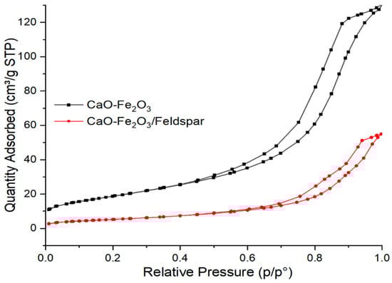 Results indicating the surface area, pore volume, and average pore size of the CaO/Fe2O3 and CaO/Fe2O3/feldspar are presented in Table 2. The CaO/Fe2O3 displayed a surface area of 68.680 m2/g, pore volume of 0.189 cm3/g, and average pore size of 7.670 nm. After the synthesis of the CaO/Fe2O3/feldspar, the surface area was 19.523 m2/g with a pore volume of 0.060 cm3/g and an average pore size of 7.911 nm. After the doping of feldspar, the surface area and pore volume of the CaO/Fe2O3/feldspar catalyst were higher than those of K-feldspar [17]. When the CaO/Fe2O3 was doped with feldspar, the surface area was reduced due to a blockage of pores by feldspar. Figure 3 illustrates the nitrogen adsorption–desorption isotherms of the CaO/Fe2O3 and CaO/Fe2O3/feldspar. The N2 adsorption–desorption isotherms exhibited a typical type IV adsorption–desorption isotherm of CaO/Fe2O3/feldspar [19]. The mesoporous pore size of the CaO/Fe2O3 and CaO/Fe2O3/feldspar were consistent, as shown in Figure 3.