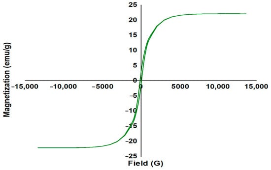 The magnetic properties of the CaO/Fe2O3/feldspar catalyst were determined using VSM, as presented in Figure 4. The VSM results revealed that the M-H loop of the produced nano-magnetic catalysts had a magnetization of 22.15 emu/g. The VSM curve for the CaO/Fe2O3/feldspar in the absence of hysteresis curves is representative of normal super-paramagnetic behavior at room temperature. These results confirmed that the iron-containing feldspar catalysts can be easily separated from the reaction mixture by using an external magnet.