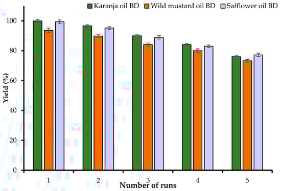 A catalytic test was carried out to assess the reusability of the CaO/Fe2O3/feldspar for repeated use without further treatment. The optimized set of conditions for each oil was chosen because it led to better performance in catalytic activity and comparison using the same catalyst. The reaction was performed five times and the respective ester yields were measured, as depicted in Figure 6.