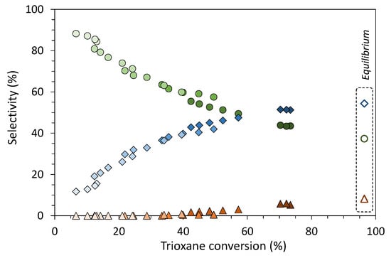 The source of formaldehyde used in the POMDME synthesis is also important to guarantee that the reaction takes place in anhydrous conditions. One of the most promising alternatives is the use of trioxane (trioxymethylene, (CH2O)3). Trioxane is produced from formaldehyde, which is obtained by partial oxidation of methanol. Hence, the use of sustainable feedstocks can be easily incorporated through methanol manufacturing processes (for example through waste gasification syngas). Trioxane decomposes to formaldehyde at reaction conditions in a reaction catalyzed by the same acid catalyst used in the POMDME synthesis. The trioxane decomposition is suggested as the limiting step of this approach. Table 1 summarizes the main results published in terms of trioxane conversion and POMDME global selectivity [].