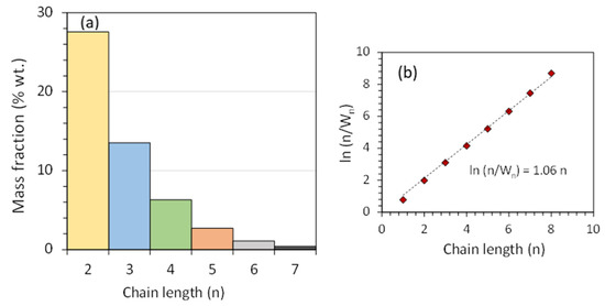 Experiments in batch configuration at high reaction times (30 h) allow analyzing the influence of the reaction temperature on the maximum trioxane conversion (equilibrium) with the subsequent products’ distribution, data required to evaluate the mechanism of chain propagation. As indicated before, a minimum temperature of 60 °C is required to guarantee the optimum products’ distribution. This temperature is significantly lower than those proposed in the literature when using other catalysts (up to 130 °C when using zeolites, see Table 1), resins being the optimum ones from the point of view of sustainability. Lower reaction temperatures (Figure 3a shows the distribution obtained at 50 °C) limit the equilibrium conversion, with the subsequent negative effect on the products distribution, obtaining a mixture enriched in POMDME2. The evaluation of the evolution of the mass fraction composition agrees with the Schulz-Flory distribution for polymerization reactions, Wn = Cn·αn, where Wn is the weight fraction of the polymers with chain length n, and α is the propagation probability factor defined as the ratio of chain growth rate to the sum of chain growth and termination rates. A value of α = 0.35 has been determined by fitting the previous equation to the product distribution, as shown in Figure 3. This fact confirms that the chain is formed stepwise by the insertion of formaldehyde units [].
