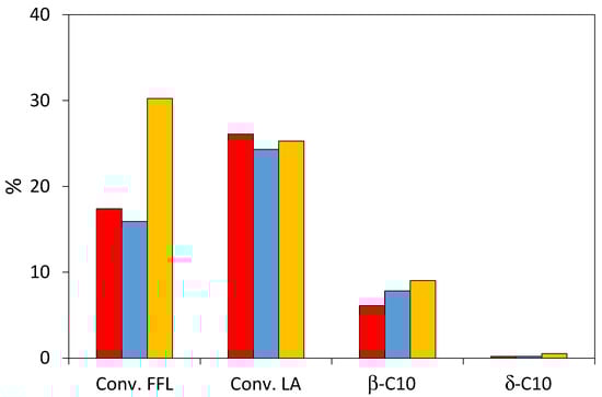 The results obtained are strongly conditioned by the LA adsorption, as observed by the discrepancy between the LA conversions obtained and the yield of both products. The relevance of this adsorption is quite similar when using A-36 and β-zeolite (similar discrepancies) and significantly more relevant when using the IR-120 resin. IR-120 is more acidic than A-36 (2.6 and 2.2 meq H+·g−1, respectively, according to titration with NaOH results, see Section 3), justifying the highest adsorption observed with this material. However, the acidity of the H-β-25 is significantly lower (1.7 meq H+·g−1). This fact is congruent with a relevant contribution of the molecular sieve effect of this microporous material (average pore diameter of 10.2 Å), not observed when working with macroporous resins (pore diameter > 20 nm in both cases, see Section 3). This hypothesis is confirmed when observing the furfural total conversion. The lack of acidic functional groups justifies the lower adsorption of this molecule observed when using resins (better correspondence between conversion and yields). On the contrary, the conversion observed with the zeolite (30.2%) is almost double that the ones with resins (<17.5%), whereas the C10 productions do not justify these differences.