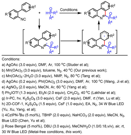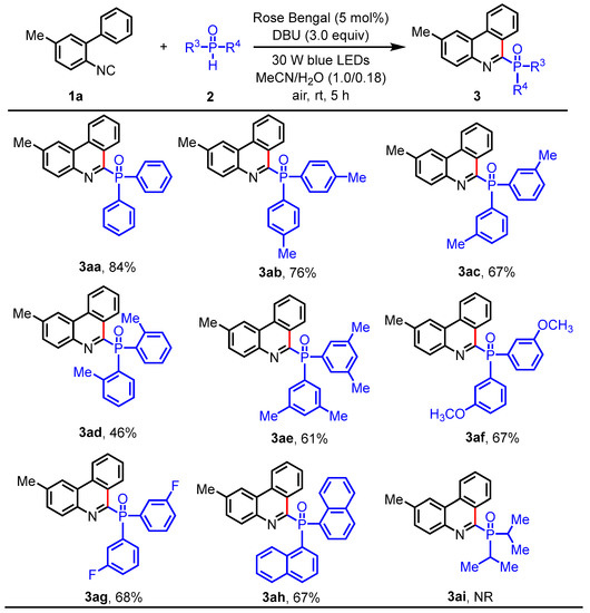 (2-Methylphenanthridin-6-yl)di-p-tolylphosphine oxide (3ab): Isolated (Rf = 0.4, EtOAc—petroleum ether = 1:3) as a white solid (64.1 mg, 76% yield), mp: 249–251 °C. 1H NMR (400 MHz, CDCl3) δ 9.45 (d, J = 8.0 Hz, 1H), 8.63 (d, J = 8.4 Hz, 1H), 8.37 (s, 1H), 7.95 (d, J = 8.4 Hz, 1H), 7.87–7.73 (m, 5H), 7.65 (t, J = 7.6 Hz, 1H), 7.52 (dd, J = 8.4, 0.8 Hz, 1H), 7.26–7.21 (m, 4H), 2.63 (s, 3H), 2.37 (s, 6H). 13C NMR (100 MHz, CDCl3) δ 156.0 (d, JC-P = 128.4 Hz), 141.9 (d, JC-P = 2.7 Hz), 141.2 (d, JC-P = 23.4 Hz), 138.9, 132.3 (d, JC-P = 9.5 Hz), 130.9, 130.4, 130.0 (d, JC-P = 106.4 Hz), 128.9 (d, JC-P = 12.5 Hz), 128.6, 127.9 (d, JC-P = 23.0 Hz), 127.7, 124.2, 122.0, 121.6, 22.2, 21.6. 31P NMR (162 MHz, CDCl3) δ 28.8. HRMS (ESI): m/z [M + H]+ calcd for C28H25NOP: 422.1668, found: 422.1670.