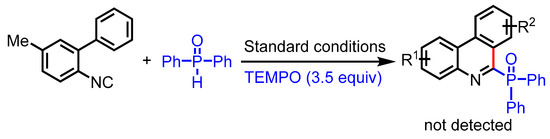 (3-Chlorophenanthridin-6-yl)diphenylphosphine oxide (3ta): Isolated (Rf = 0.4, EtOAc—petroleum ether = 1:3) as a white solid (30.6 mg, 37% yield), mp: 194–197 °C. 1H NMR (400 MHz, CDCl3) δ 9.44 (d, J = 8.4 Hz, 1H), 8.48 (d, J = 8.0 Hz, 1H), 8.40 (d, J = 8.8 Hz, 1H), 7.95 (d, J = 1.6 Hz, 1H), 7.87–7.80 (m, 4H), 7.76 (t, J = 7.6 Hz, 1H), 7.64–7.54 (m, 2H), 7.47–7.41 (m, 2H), 7.41–7.32 (m, 4H). 13C NMR (100 MHz, CDCl3) δ 158.5 (d, JC-P = 125.7 Hz), 143.2 (d, JC-P = 23.4 Hz), 134.5, 132.6 (d, JC-P = 104.5 Hz), 132.2 (d, JC-P = 9.1 Hz), 131.9, 131.5, 130.1, 129.3, 128.8, 128.3 (d, JC-P = 12.3 Hz), 127.8 (d, JC-P = 22.7 Hz), 123.6, 122.9 (d, JC-P = 2.4 Hz), 122.0. 31P NMR (162 MHz, CDCl3) δ 28.3. HRMS (ESI): m/z [M + H]+ calcd for C25H18ClNOP: 414.0809, found: 414.0816.