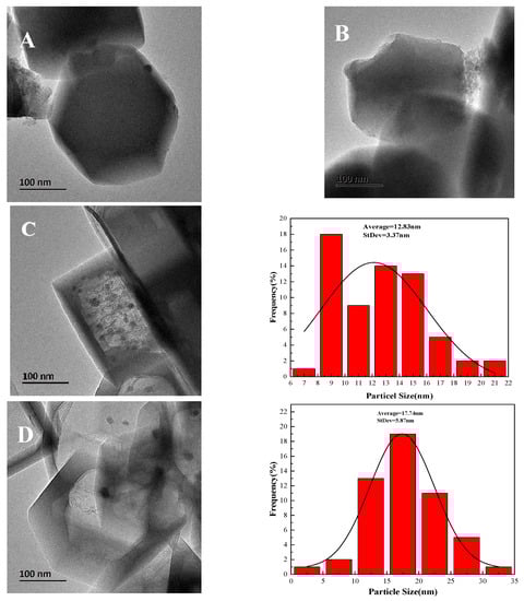 Figure 3 shows the TEM micrographs obtained from the fresh catalysts. The images of Figure 3A–D, respectively, correspond to the Cu-S, CuFe0.5-S, Cu@S and CuFe0.5@S samples. Compared to the encapsulated structural catalysts, Cu-S and CuFe0.5-S did not display visible metal oxide nanoparticles uniformly distributed on the zeolite frameworks, which might be attributed to aggregation of metal particles under the calcination process of the samples. Nevertheless, Cu@S and CuFe0.5@S showed obvious uniform nanoparticles embedded in the cavity of the zeolite, which was consistent with the N2-BET results. The CuO nanoparticle size of the Cu@S and CuFe0.5@S were 12.83 nm and 17.7 nm, respectively, resulting from counting at least 80 particles of several TEM images, which were slightly smaller than the results (17.6 nm for Cu@S and 22.2 nm for CuFe0.5@S) calculated via XRD. Additionally, the metal dispersion (D) was calculated from the equation according to the methodology proposed in [25] by using the relationship between the number of surface (ns) and total (nt) atoms. The coefficient k can be expressed via the equation [5] , where M is the molar mass, accounts for the density, NA denotes Avogadro’s number and d is the particle size. Based on the above equation, the dispersions for Cu-S, CuFe0.5-S, Cu@S and CuFe0.5@S were 7.96%, 7.74%, 14.63% and 10.38% which were summarized in Table 2. The chemical compositions of samples, analyzed by XRF and XPS, are also listed in Table 2. XPS is a surface technique with an analysis depth of ˂10 nm and XRF can analyze the bulk composition, therefore, XPS/XRF can be used to characterize the distribution of Cu on the sample surface and inside the cavity of the zeolite [23,26]. By comparing the results of XPS/XRF, the encapsulated structural samples Cu@S and CuFe0.5@S had smaller ratios than the Cu-S and CuFe0.5-S samples, which further confirms the Cu species were successfully encapsulated into the S-1 zeolite. These results are consistent with the TEM images.