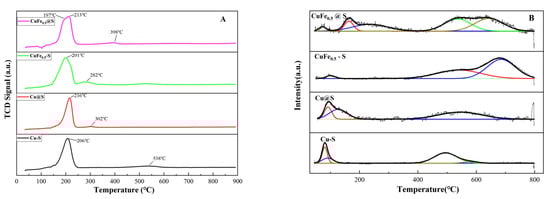 The reducibility of different catalysts was exhibited in Figure 4A. All the samples present obvious reduction peaks near 200 °C, which could be ascribed to the characteristic peak of CuO. The difference was that the peaks of Cu@S and CuFe0.5@S shifted to higher temperatures compared to Cu-S and CuFe0.5@S, which might be due to the Metal-Si strong interaction resulting from the encapsulated structure catalysts that suppressed the reduction of the metal oxide [18,19]. Additionally, other reducibility peaks of Cu at higher temperatures could be attributed to the presence of highly dispersed Cu2O species. For the Cu-Fe bi-metal catalysts, the peak between 300 °C and 400 °C is the reduction peak of FeOx.