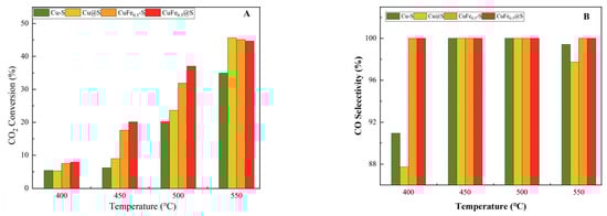 Catalytic performance for the samples at 17.8 L/h at H2/CO2 = 3/1: (A) Conversion of CO2; (B) CO selectivity.