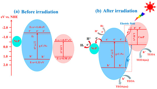 - Sun, W.; Fu, Z.; Shi, H.; Jin, C.; Liu, E.; Zhang, X.; Fan, J. Cu3P and Ni2P co-modified g-C3N4 nanosheet with excellent photocatalytic H2 evolution activities. J. Chem. Technol. Biotechnol. 2020, 95, 3117–3125. [Google Scholar] [CrossRef]