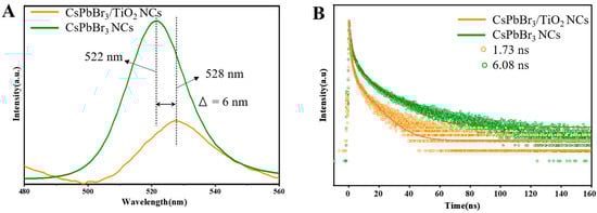 Since most applications of perovskite are related to its photoelectric and catalytic properties, it is desirable that materials have both environmental stability and efficient charge transport. To gain more insight into the material charge transfer kinetics, we recorded the photoluminescence (PL) emission spectra and time-resolved photoluminescence spectra (TRPL) of CsPbBr3 NCs and asymmetrical CsPbBr3/TiO2 NCs (Figure 3). As shown in Figure 3A, the photoluminescence emission peaks of CsPbBr3 NCs and CsPbBr3/TiO2 NCs at about 522 nm and 528 nm, respectively, can be observed. Compared with CsPbBr3 NCs, the PL peak of CsPbBr3/TiO2 NCs is slightly red-shifted by 6 nm. After TiO2 shell coating, the PL intensity decreases. Figure 3B shows the TRPL of CsPbBr3 NCs and asymmetrical CsPbBr3/TiO2 NCs. The fitted decay curves reveal that the CsPbBr3/TiO2 NCs (τ = 1.73 ns) have shorter carrier lifetime compared with CsPbBr3 (τ = 6.08 ns), and the decreased PL lifetime indicates improved charge diffusion and separation, i.e., the rapid charge transfer from CsPbBr3 NCs to the TiO2 shell, thus leading to enhanced photovoltaic performance. The reduced fluorescence lifetime further manifests that after TiO2 shell coating, the CsPbBr3/TiO2 core/shell NCs generate a new nonradiative path, probably an electron transfer from the conduction band of CsPbBr3 NCs to the conduction band of titanium dioxide, indicating the formation of type II heterojunctions, which greatly facilitates the separation of electron–hole pairs and CsPbBr3/TiO2 NCs with higher carrier mobility [43].