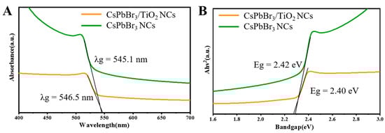 (A) Ultraviolet–visible spectroscopy (UV–Vis) of CsPbBr3 NCs and asymmetrical CsPbBr3/TiO2 NCs. (B) Absorbance versus photon energy and the determined bandgap Eg of CsPbBr3 NCs and asymmetrical CsPbBr3/TiO2 NCs.