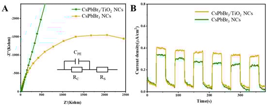 The electrochemical impedance spectra (ESI) and the photoresponsive current densities of CsPbBr3 NCs and CsPbBr3/TiO2 NCs materials were tested as shown Figure 5. The charge transport properties of CsPbBr3 NCs and CsPbBr3/TiO2 NCs were further investigated by photoelectrochemical studies. The Nyquist plot is generally used in EIS and the Nyquist plot of the most common equivalent circuit model is semicircular in shape. In the equivalent circuit model, Cpe represents the double-layer capacitance, Rs represents the solution resistance from the reference electrode to the working electrode, and Rc is the charge transfer resistance of the electrode. The diameter of the semicircle is equal to the carrier migration resistance, and the smaller the diameter of the semicircle, the larger the carrier migration rate. As shown in Figure 5A, the curvature of the impedance spectrum of CsPbBr3/TiO2 NCs is significantly greater than that of CsPbBr3 NCs. Additionally, because the curvature of the circle is inversely proportional to the radius, the CsPbBr3/TiO2 NCs has a smaller semicircle arc compared with CsPbBr3 NCs. In other words, CsPbBr3/TiO2 NCs have a smaller carrier migration resistance than CsPbBr3 NCs. To sum up, with the formation of TiO2 shells, the charge transfer resistance of the CsPbBr3/TiO2 NCs is significantly reduced. In order to record the photocurrent generated by the photoresponse and exclude the effect of other factors, the light source is usually switched on at certain intervals to record the photocurrent profile. As shown in Figure 5B, when the light source was turned off, the recorded photocurrent density was almost zero; when the light source was turned on after 30 s, the current instantaneously increased; and when the light source was turned off at an interval of 30 s, the current instantaneously decreased. Compared with CsPbBr3 NCs, CsPbBr3/TiO2 NCs have higher current density. This result further confirms that the formation of heterostructure between CsPbBr3 and TiO2 improves the carrier migration efficiency of the perovskite material and has better charge transport properties.