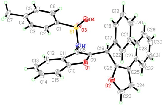 General Information. All solvents were dried over molecular sieves. Unless otherwise noted, materials obtained from commercial suppliers were used without further purification. We synthesized 3-Yne-1,2-diols according to methods outlined elsewhere [,,]. Aurone-derived azadienes [] and para-quinone methides [] were independently prepared according to the corresponding references. The products were isolated using column chromatography on silica gel (200–300 mesh) by using petroleum ether (PE, 30–60 °C) and ethyl acetate (EA) as eluents. All yields described herein were the isolated yields after column chromatography. Reaction progress and product mixtures were routinely monitored by using TLC using TLC SiO2 sheets, and compounds were visualized under ultraviolet light. 1H NMR and 13C NMR spectra were recorded on Bruker DPX 400 MHz spectrometer. The spectra were recorded using CDCl3 as a solvent. 1H NMR chemical shifts are referenced to tetramethylsilane (TMS, 0 ppm). Abbreviations are as follows: s (singlet), d (doublet), t (triplet), q (quartet), m (multiplet). High-resolution mass spectra (HRMS) were recorded on a microTOF-QII HRMS/MS instrument (BRUKER). X-ray crystallographic analysis was performed using a Siemens SMART CCD and a Siemens P4 diffractometer.