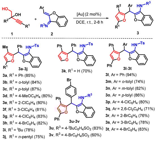 Homogeneous gold catalysis has attracted long-standing attention from organic chemists over the past two decades [,,,]. This is attributed to the fact that such catalysis can produce numerous natural products and bioactive functional molecules and provide great potential for drug discovery and biomedical research. Notably, the salient features of such catalysis include mild conditions, high efficiency and excellent selectivity, and even gold catalysts have lower toxicity and higher environmental compatibility than other transition metals [,,,,]. Specifically, gold self-relay catalysis, which catalyzes two or more distinct elementary reactions under the same reaction conditions, extensively enhances synthetic efficiency and has attracted great interest in the organic community [,,,]. Many elegant gold self-relay catalysis reactions for the construction of complex cyclic structures have been documented [,,]. A particularly attractive gold-catalyzed cyclodehydration of 3-yne-1,2-diols toward functionalized furans was recently demonstrated, showing the compatibility between gold catalysts and furans [,,]. Along this line, we reasoned that the utilization of furans generated in situ from 3-yne-1,2-diols as soft pronucleophiles to react with suitable 1,4-Michael acceptors under the catalysis of gold catalysts may generate unsymmetrical furanized triarylmethanes. In an attempt to add to the literature on relay catalysis [,,], in this paper, we describe the gold relay catalysis of 3-yne-1,2-diols 1 and aurone-derived azadienes 2, allowing catalytic annulation and subsequent 1,4-addition to give furanized triarylmethanes 3 in good yields (Scheme 1e). Exchanging aurone-derived azadienes for para-quinone methides (p-QMs) 4 resulted in skeletally different furanized triarylmethanes 5 with good yields through a cascade annulation and subsequent 1,6-addition sequence (Scheme 1d). It is worth noting that the present protocol demonstrates the simultaneous utilization of two robust π- and σ-acidity of gold catalysts, enabling their catalytic activation modes to sequentially govern a complex process consisting of annulation and nucleophilic addition.