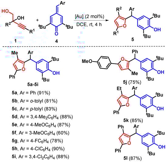 Substrate scope for forming triarylmethanes 5. Note: Reaction conditions: 3-yne-1,2-diols 1 (0.2 mmol, 1.0 equiv) with p-QMs 4 (0.2 mmol), JohnPhosAu(MeCN)SbF6 (2 mol%), DCE (2.0 mL), room temperature for 4 h. Isolated yield.