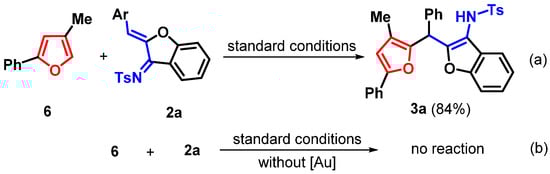To gain mechanistic insight into this gold catalysis, several control experiments were performed as described in Scheme 4. To ascertain the role of the gold catalyst in the 1,4-addition process, the preformed furan 6 was reacted with 2a, leading to an 84% yield of product 3a (Scheme 4a). These outcomes revealed that furans should be the great possibility of reaction intermediates. Without a gold catalyst, the reaction of furan 6 with 2a did not take place (Scheme 4b), demonstrating that the gold catalyst is crucial for every elementary reaction step; thus, a new gold self-relay catalysis involving cyclization and 1,4-addition was established.