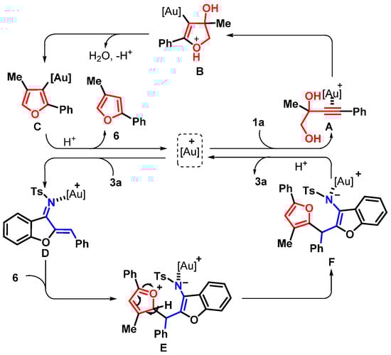 Based on the above experimental results and the literature precedents [,,], a plausible explanation of the reaction outcome is depicted in Scheme 5. With 3-yne-1,2-diol 1a and aurone-derived azadiene 2a as representative examples, this might initially involve Au(I)-catalyzed cyclodehydration and subsequent proto-deauration, yielding furan intermediate 6. Next, the coordination of the gold complex to aurone-derived azadiene 2a provides Au(I) σ-complex D, intercepted by furan 6 to give E through 1,4-addition. The following proton transfer and proto-deauration afford the expected product 3a, together with the regeneration of the gold catalyst for the next catalytic cycle. Therefore, the formation of 3a includes a tandem reaction catalyzed by the same gold complex (self-relay catalysis). In the overall process, the gold catalyst played the dual role of π-Lewis acid-type activation of the triple bond for cyclization and σ-Lewis acid-type activation of imines for Michael addition. This case represents a new example of gold-catalyzed self-relay catalysis.