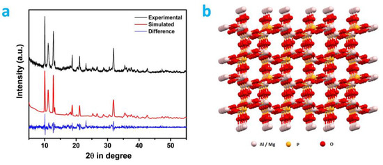 (a) Wide-angle powder XRD patterns: experimental (black), simulated (red), and difference (blue). (b) Ball and stick model of MALPO.