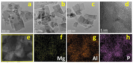 Transmission electron microscopy images of MALPO at different magnifications (a–d), selected area image under elemental mapping (e), elemental mapping of MALPO and the distribution of magnesium (Mg, (f)), aluminum (Al, (g)) and phosphorus (P, (h)).
