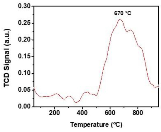 In addition to the morphological evaluation, an elemental distribution (Figure 4f–h) analysis was performed using energy-dispersive X-ray spectroscopy (EDAX) on the TEM images. Notably, the results obtained demonstrate that a strikingly uniform presence off elements throughout MALPO. CO2–TPD analysis was carried out under an inert He gas flow, and the corresponding CO2 desorption profile of MALPO is shown in Figure 5. As can be seen from this CO2–TPD profile, a broad CO2 desorption peak with maxima at a very high temperature of 670 °C can be observed. The presence of no significant CO2 desorption peaks at lower temperatures suggests that CO2 molecules are strongly bound at the MALPO surface. The observed total basicity was 3.15 μmol g−1. On the other hand, to measure the surface acidity of MALPO, we performed acid–base titration (see the Supporting Information), which suggested a total acidity of 0.71 mmol g−1. The presence of defect phosphate groups are responsible for this surface acidity in MALPO.