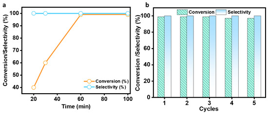 Conversion/selectivity plot with respect to the time (a) and the recyclability experiment (b).