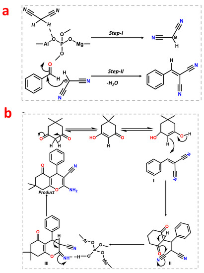 Probable mechanistic pathway for the Knoevenagel condensation reaction (a) and Knoevenagel–Michael cyclo-condensation (b).